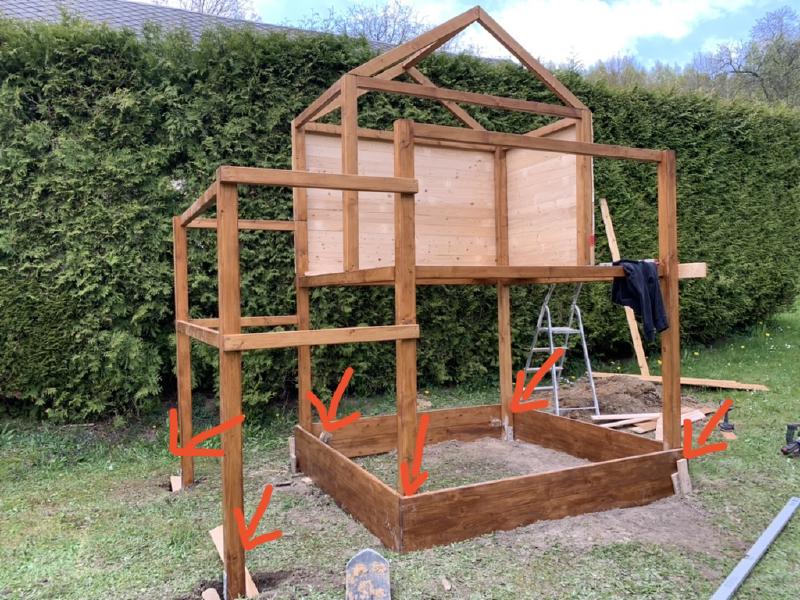 Next step was to fix the skeleton into the ground. I decided to make foundations from concrete, so I dug 6 holes for all 6 fixing points, 70cm deep (so it is protected from freezing), mounted the anchors to the playground skeleton and put them into the concrete. After several days, the concrete was hard and so the playground will be solid as fuck. Concrete was about 1200 CZK in total, since I need to buy more multiple times (poor estimate)