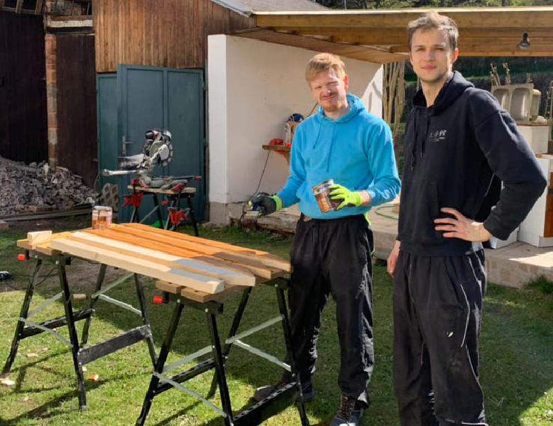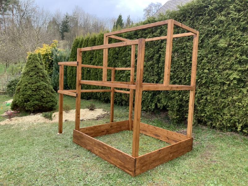 We dived into the building. First thing needed was shortening all the beams to desired lengths according to the plans. When all was set, the surface of all beams needed to be made coarse, so the sandpaper and electric orbit sander helped. After that, all beams needed to be painted with exterior paint in the colour of walnut wood (the beams itself are made of spruce wood). In the end, multiple layers will be needed, so I bought about 3 litres of exterior paint in total of about 1500CZK.