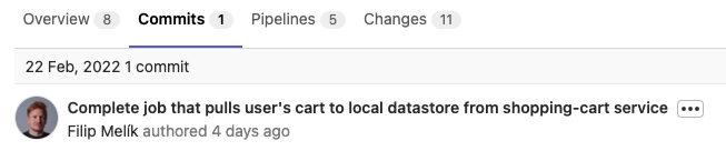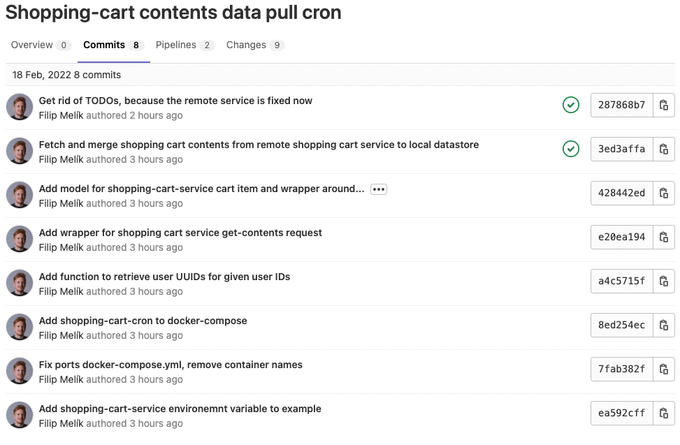 A single image usually speaks more than a thousand words, so this is how it usually looks in my case (the commits are sorted by time from the bottom to the top, so the first commit is Add shopping-cart-service environment variable to example):