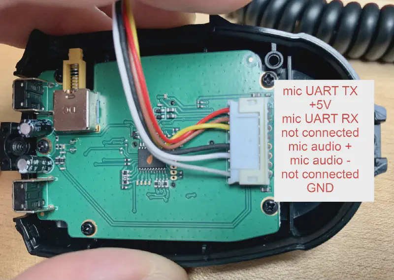 Initially, I thought that PTT functionality will be implemented in analog way, in similar fashion like on all baofengs etc. - that means grounding some pin on the microphone connector. So to test this hypotesis, I went googling for the Anytone AT-779UV microphone connector pinout, but I found only partial information, mainly about have to make programming cable and which pins are serial UART, but not the complete pinout. That meant time for screwdriver and microphone teardown.