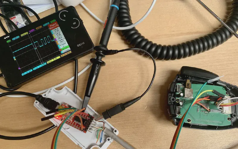 First thing when reverse engineering the serial communication protocol is that you need to determine the RX/TX pins, error correction mechanism, flow control and the speed, also known as Baud rate. Baud rate can be determined by multiple ways. The best one is to use logic analyzer and associated software that is capable not just determining the speed, but also decoding the protocol. I have no such measurement instrument, so I fell back to the good old oscilloscope. I have measured the duration of one “pulse”, which was around 8μs. Computing the Baud rate is matter of computing 1/0.000008 = 125000. The closest “standard” Baud rate is 115200, so this is how I determined the Baud rate.
