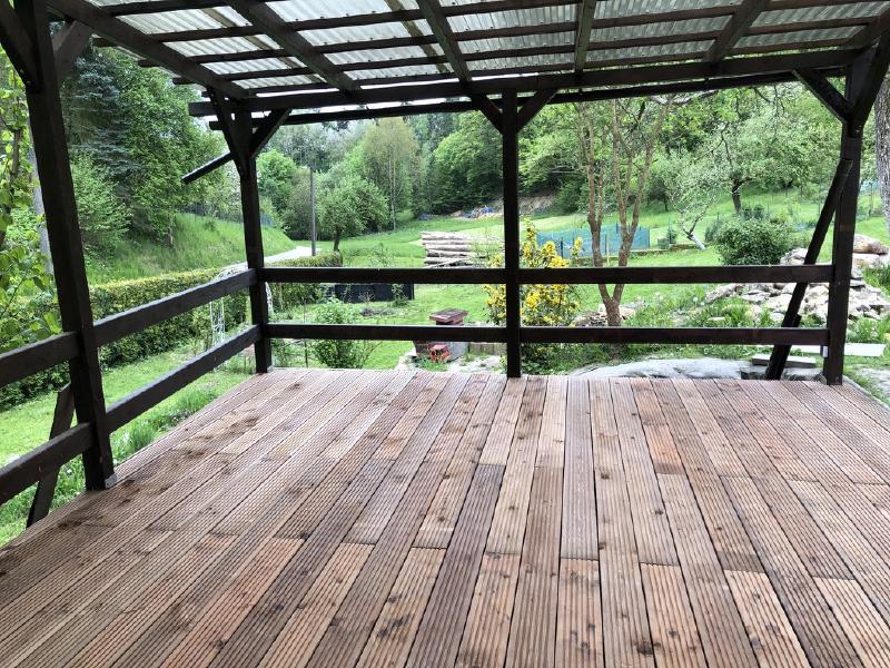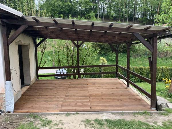 Last and the most rewarding part was to install the flooring. I was looking at the WPC (wood plastic composite) planks at first, because they offer no maintenance (since it’s plastic). But they are more expensive than wood and 1000% uglier than real wood (plus I love wood). So I chose the basic pine planks (the exotic wood is more durable but far more expensive than basic pine). My father-in-law helped me with his big-ass car to get it on the building-site and then with the assembly too, so we have it faster (he is a woodworker, which helps). My parents helped with coating planks with the decking oil, to make it more sun+wear resistant.
